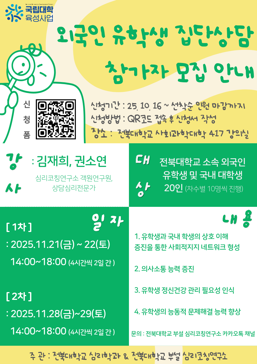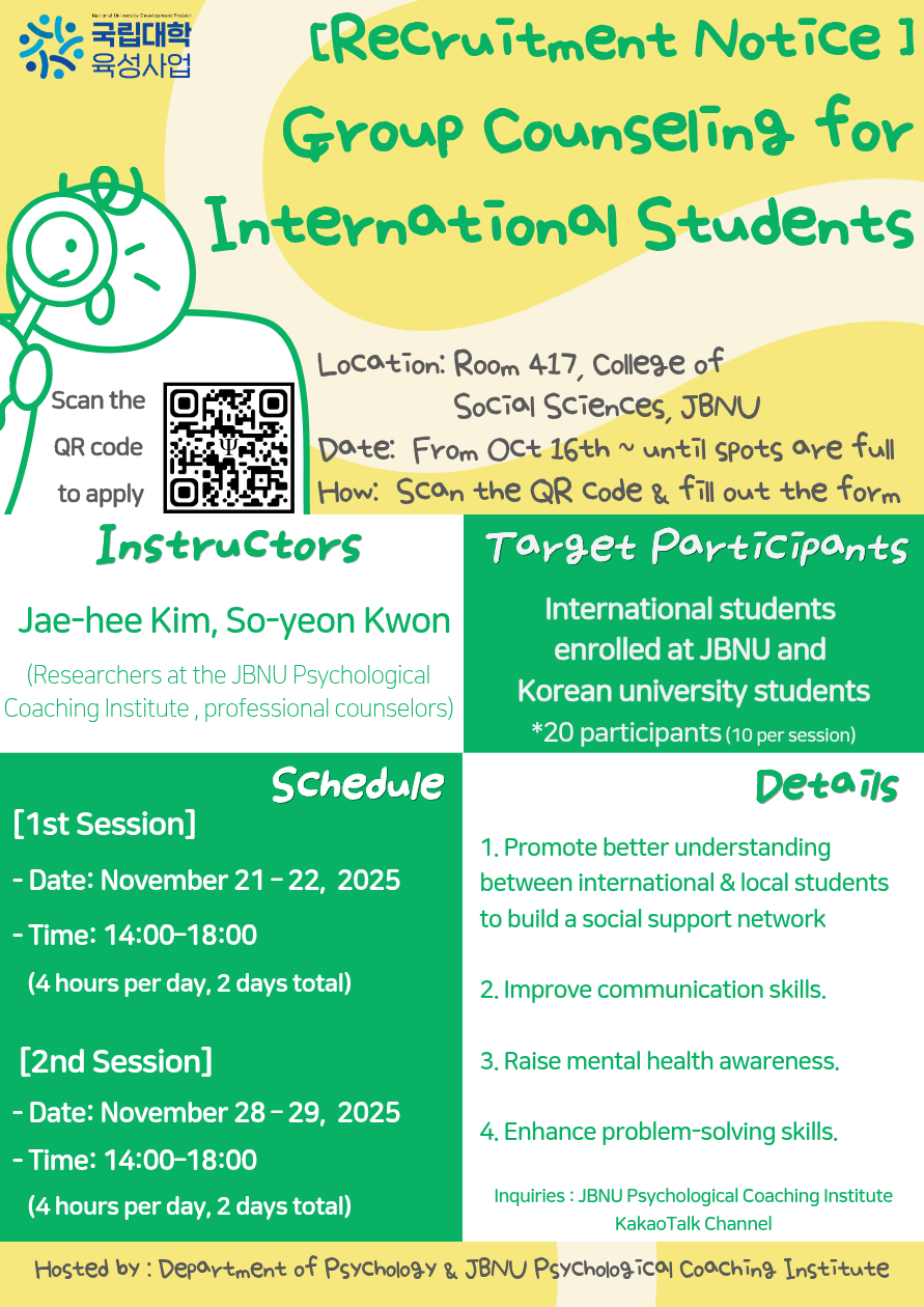 심리학과 & 심리코칭연구소에서는 국립대육성사업의 일환으로 외국인 유학생 정서관리를 위한 집단상담을 운영합니다. 유학생들의 스트레스를 관리하고, 대인관계 기술 증진, 심리정서 건강 증진을 위한 프로그램으로 운영이 되오니 관심있는 학생들의 많은 참여 바랍니다.