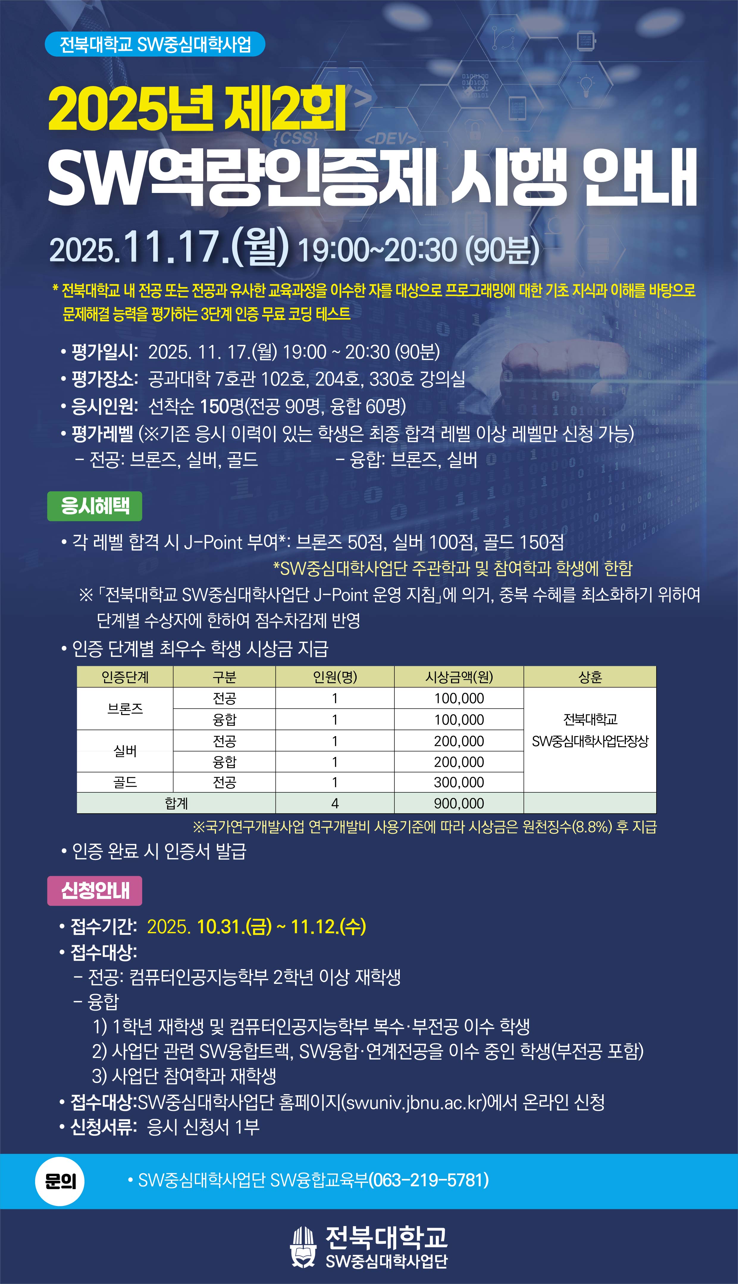 - 신청기간: 2025.10.31.(금) ~ 2025.11.12.(수)) 내에 SW중심대학사업단 홈페이지에서 신청하실 수 있습니다.