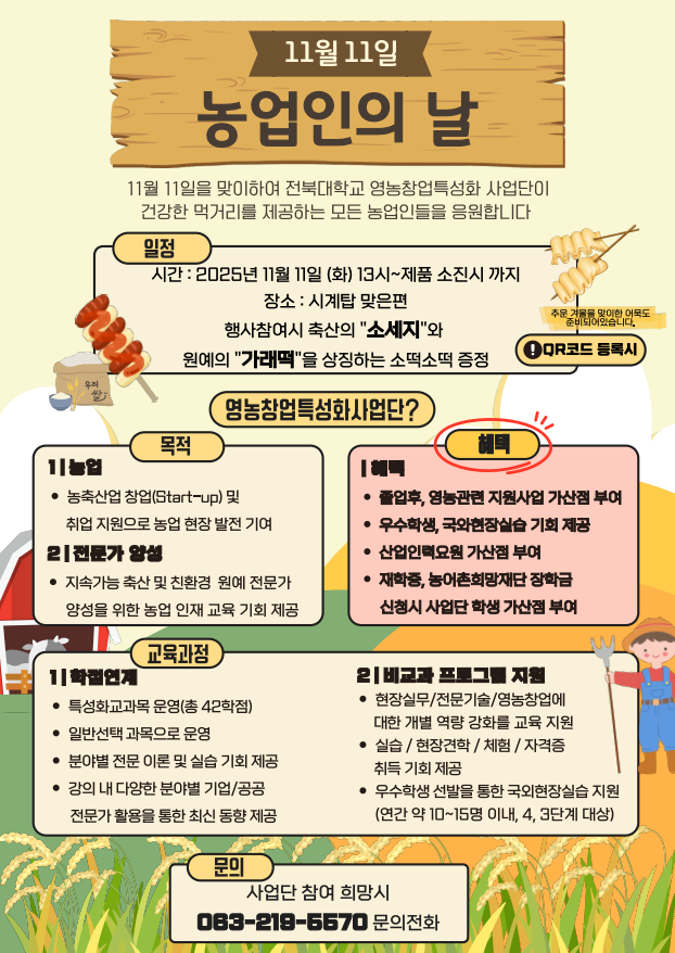 영농창업특성화 사업단에서 준비한 농업인 날 퀴즈도 맞히시고(QR로 진행) 맛있는 간식도 받아 가세요!~