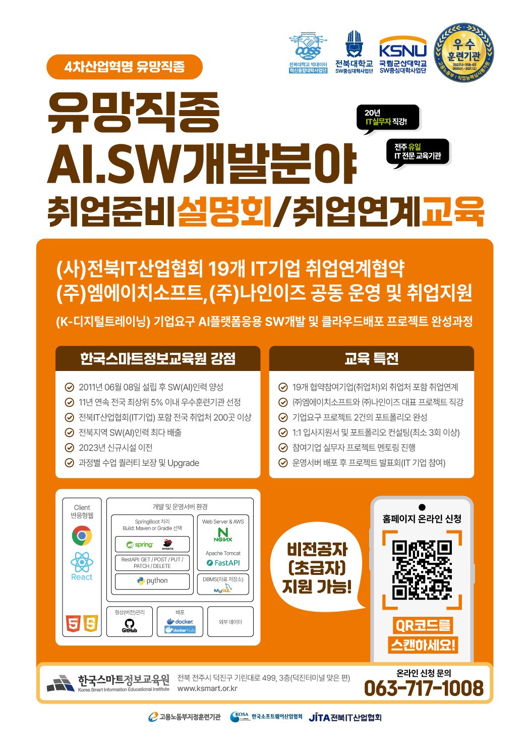 전북대학교 빅데이터혁신융합대학사업단,SW중심대학사업단과 함께 한국스마트정보교육원에서 SW(AI포함) 개발분야 취업준비 설명회를 진행하오니