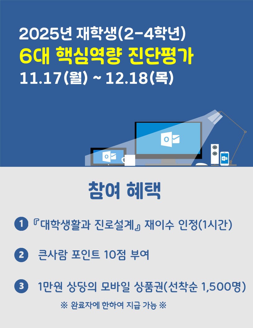 2025학년도 재학생(2-4학년) 6대 핵심역량 진단평가를 아래와 같이 실시하오니, 재학생 여러분들의 많은 참여바랍니다.