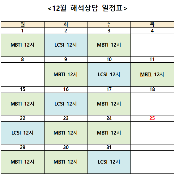 ○ 1월 심리검사 신청 일정은 12월 넷째주 월요일(12/22) 오후에 확인할 수 있습니다.