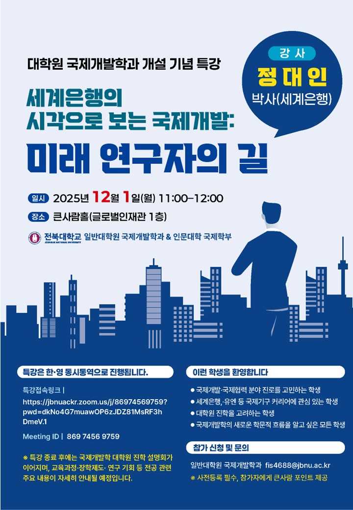 ※ Following the lecture, a graduate program information session will be held, covering curriculum, scholarship opportunities, and research tracks in the International Development Studies program.
