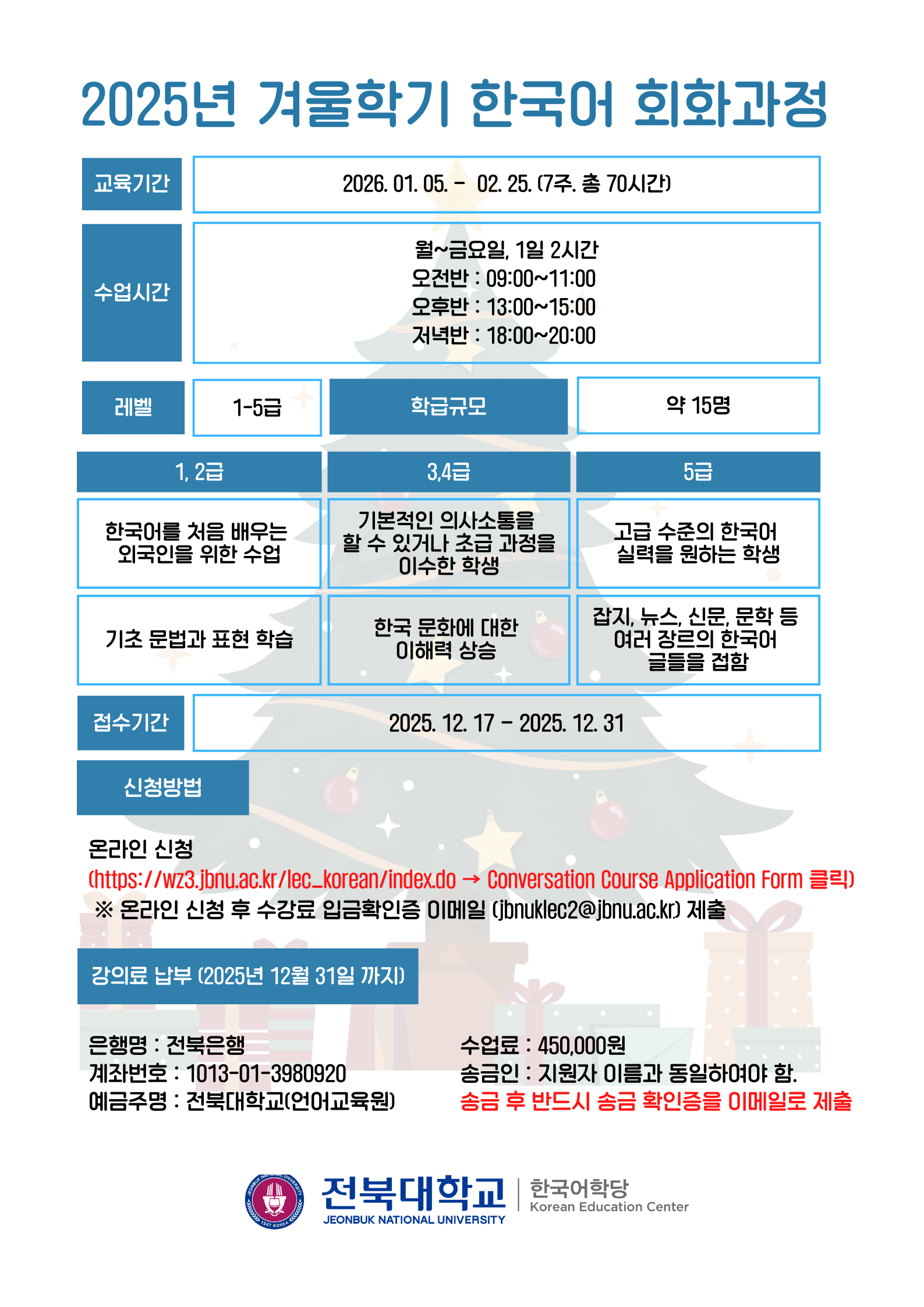 ※ After completing the payment, please send the receipt to our email: jbnuklec2@jbnu.ac.kr
